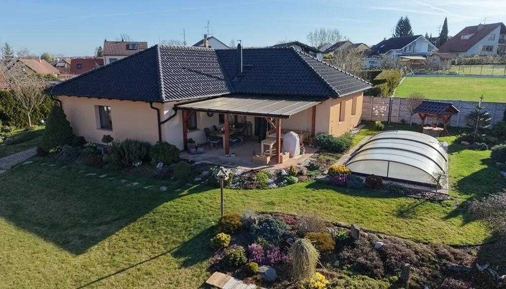 K domu náleží pozemek o celkové výměře přibližně 1 338 m², který poskytuje dostatek prostoru pro odpočinek i dostatečné soukromí. Na zahradě se nachází bazén a okrasné jezírko, které dotváří příjemnou atmosféru celého místa.