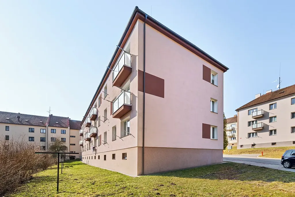 Byt se nachází ve zvýšeném přízemí cihlového bytového domu. Dispozice zahrnuje kuchyni, dva pokoje, předsíň, koupelnu a samostatné WC. K bytu náleží také sklep o 4,6 m2.