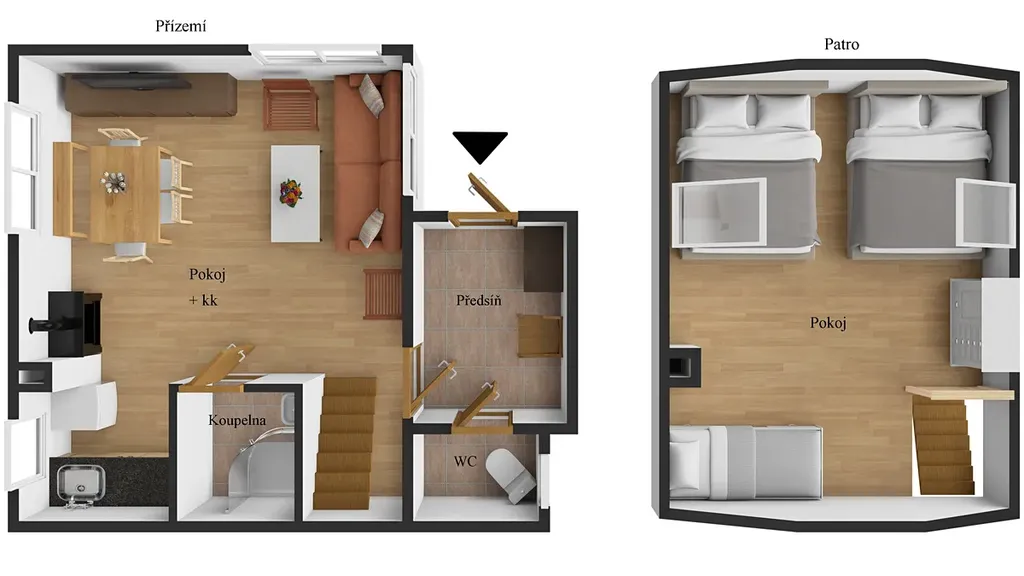 Přízemí: kuchyň propojená s obývacím pokojem, koupelna a samostatné WC