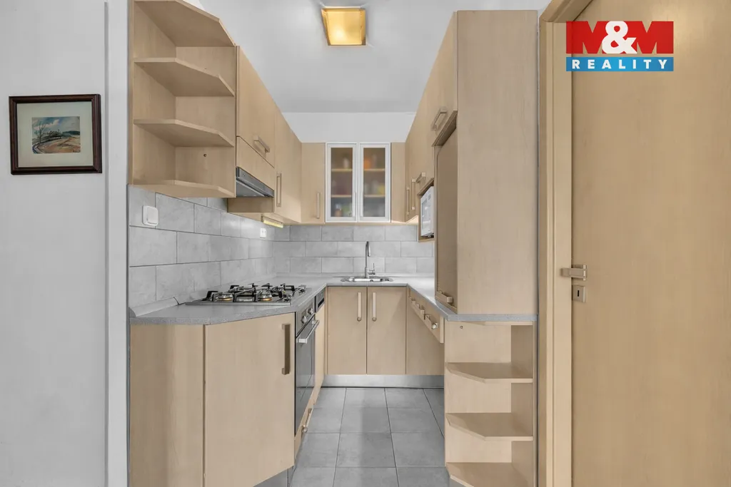 Dispozice bytu je velmi praktická. Kuchyňská linka ve tvaru U navazuje na obývací prostor a poskytuje dostatek pracovního i úložného místa.