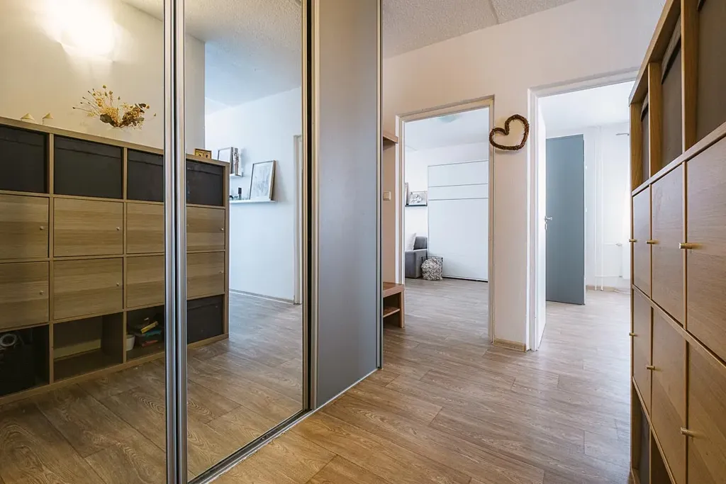 Bytová jednotka se nachází v 2.NP panelového domu bez výtahu. Byt disponuje vstupní chodbou se skříní, samostatným WC, koupelnou s vanou, kuchyňskou linkou se spotřebiči, obývacím pokojem a dvěma dětskými pokoji. Z obývacího pokoje je přímý vstup na balkon. K bytu náleží také sklep 2,1 m². Byt má PVC podlahy a dlažbu (koupelna, WC). Celý byt prošel v roce 2015 rekonstrukcí. Nové radiátory, voda, elektřina, odpady, koupelna, kuchyň. Okna plastová dvojskla. Vytápění bytu i ohřev vody je zajištěn z centrální kotelny (plyn). Celý dům prošel revitalizací (zateplení + nová fasáda).Energetická náročnost budovy je D. Měsíční náklady na bydlení jsou cca 8 000 Kč.