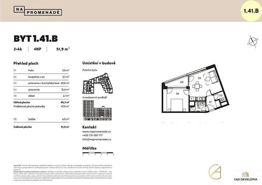 Bytová jednotka s projektovým označením 1.41.B o dispozici 2+kk a velikosti podlahové plochy 47,9 m2 s lodžií o velikosti 4 m2 se nachází ve 4. nadzemním podlaží jednoho z elegantních bytových domů projektu. Dokončení projektu je plánováno na 3. čtvrtletí roku 2027. Bytové domy budou postaveny jako energeticky úsporné. Součástí standardu jsou trojitá izolační skla, která zajistí skvělou tepelnou i zvukovou izolaci a tím i maximální pocit klidu a soukromí.