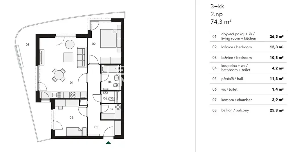 Byt nabízí k užívání obývací pokoj s kuchyňským koutem, 2 ložnice, koupelnu s vanou a toaletou, druhou samostatnou toaletu, chodbu a komoru. Přímý vstup na balkón je ze všech hlavních místností. K dispozici je i sklep a garážové parkovací stání, další parkovací stání za příplatek 1 500 Kč/ měsíc.