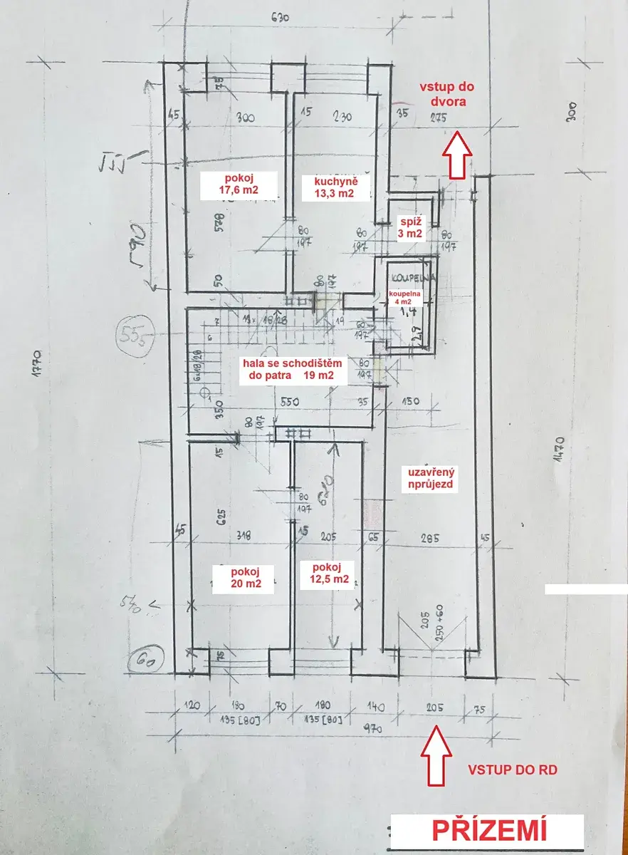 Celková obytná plocha je 205 m2. Bytová jednotka v přízemí je dispozičně řešena jako 3+1 – 89,4 m2 (pokoj 20 m2, pokoj 17,6 m2, pokoj 12,5 m2, kuchyně 13,3 m2, koupelna 4 m2, spíž 3 m2, hala se schodištěm do patra 19 m2).