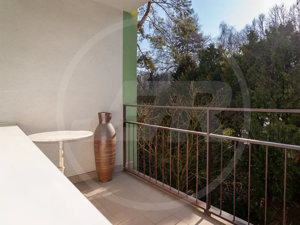 Dům stojí v klidné ulici, kam je orientováno okno z kuchyně. Balkon a ložnice jsou s výhledem do zeleně.