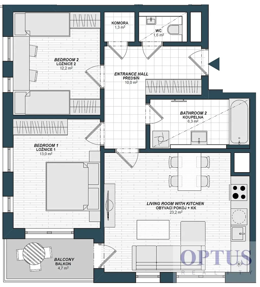 Byt tvoří obývací pokoj o velikosti 23,2 m2 propojený s plně vybaveným kuchyňským koutem a se vstupem na balkon, 2 ložnice (13 m2 a 12,2 m2), koupelna s vanou, samostatná toaleta s bidetovou sprškou, komora a předsíň.