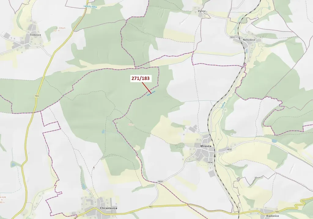 Lesní pozemek o výměře 2 398 m2, parcelní číslo 271/183, podíl 1/1, katastrální území Milavče, obec Milavče, obec s rozšířenou působností Domažlice, okres Domažlice, Plzeňský kraj. Po těžbě.