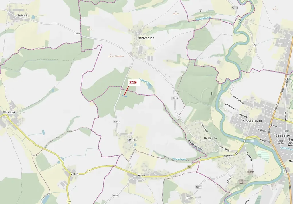 Lesní pozemek o výměře 1673 m2, parcelní číslo 219, podíl 1/1, katastrální území Mokrá u Soběslavi, obec Vesce, obec s rozšířenou působností Soběslav, okres Tábor, Jihočeský kraj. Po těžbě.