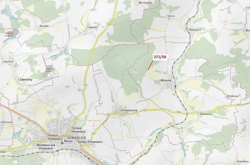 Lesní pozemek o výměře 2102 m2, parcelní číslo 271/58, podíl 1/1, katastrální území Milavče, obec Milavče, obec s rozšířenou působností Domažlice, okres Domažlice, Plzeňský kraj. Po těžbě.