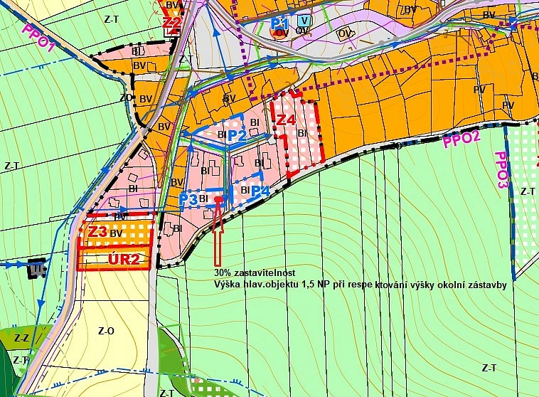 Výška hlavního objektu nepřekročí 1.5 nadzemního podlaží při respektování okolní výškové hladiny a charakteru stávající zástavby. Na hranici pozemku je elektřina, přípojka veřejného vodovodu, v komunikaci je veřejná kanalizace a plyn. Veškerá občanská vybavenost je v obci Kdyně 6 km vzdálené. Doporučuji.