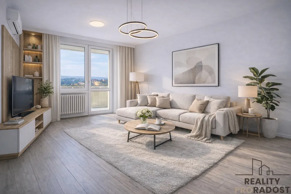 Představte si slunný byt v 8. patře, kde si ráno vychutnáte kávu na balkonu s příjemným výhledem na město a okolí Znojma.