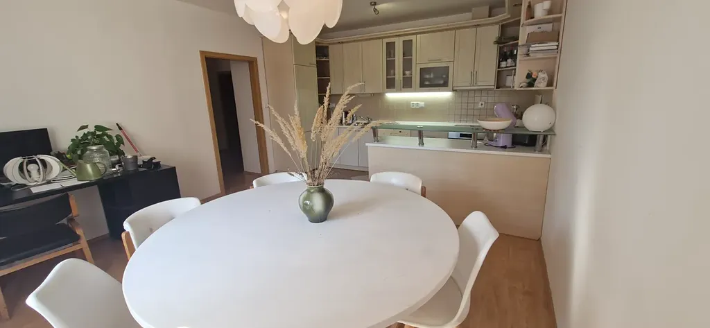 Dispozičně se byt skládá z obývacího pokoje s kuchyňským koutem a jídelní částí, ložnice s balkonem, dalšího pokoje, koupelny a samostatné toalety. Kuchyňská linka je plně vybavena včetně spotřebičů. V ložnici se nachází manželská postel a vestavěné skříně.Byt je volný od 1.4.2026