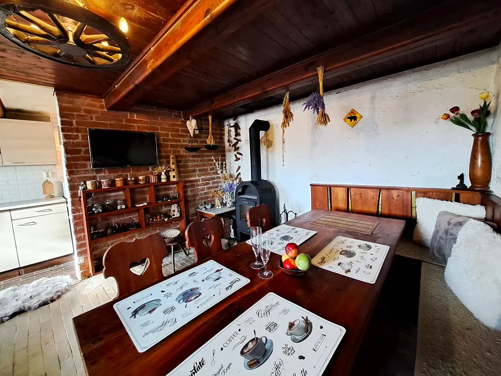 V přízemí se nachází kuchyňská linka s jídelním koutem a krbovými kamny. V horním patře pak chodba se vstupem do ložnice, suché WC. Chata disponuje velkou terasou s grilem a posezením, která nabízí krásný výhled do zeleně a na přilehlý rybník, kde je ráj pro rybáře. U chaty je také vybudované zázemí s ohništěm a udírnou.