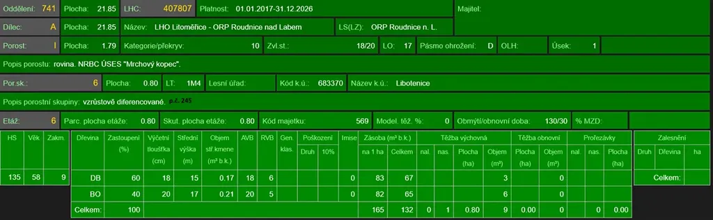 - p.č. 245 vedená jako lesní pozemek o celkové výměře 8 387 m2 (stáří lesa 67 let - zastoupení dřevin dub, borovice).