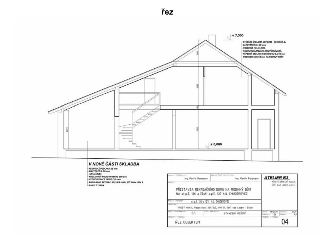 Dispozice: 1.PP: sklep; 1.NP: předsíň, chodba, OP, tech.místnost, chodba + schodiště, koupelna + WC, jídelna, kuchyň, spíž, pokoj, šatna, garáž, terasa; Podkroví: ochoz + chodba, koupelna + WC, 2x pokoj, komora. Fáze rozestavěnosti je 70%. Stavební práce jsou prováděny se souhlasem SÚ.
