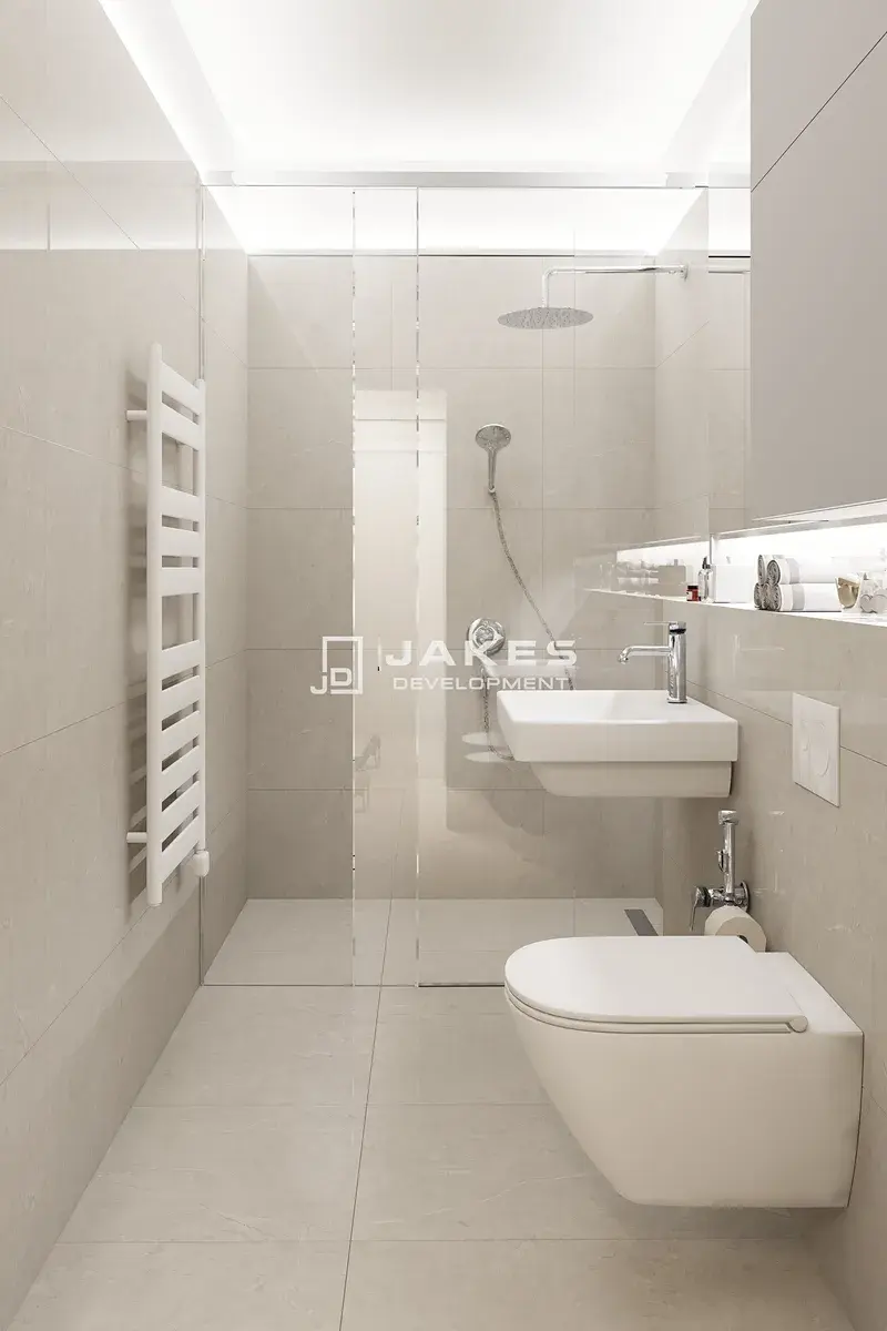 Koupelna bude vybavena podlahovým vytápěním, velkoformátovým zrcadlem, praktickým úložným systémem niky ve sprchovém koutě a sanitou značky Laufen. Vše je navrženo s důrazem na nadčasový design, funkčnost a kvalitu použitých materiálů.