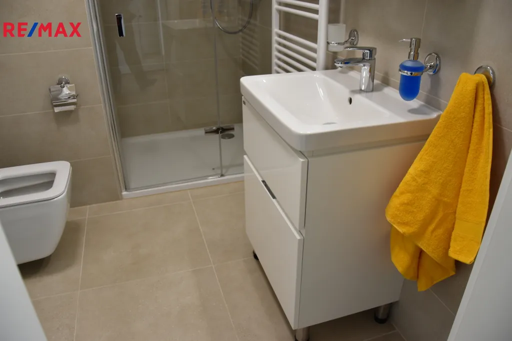 V předsíni se nachází vestavný věšák s botníkem a posezením. V bytě je podlahové vytápění a klimatizační jednotka. Koupelna se sprchovým koutem, dále se zde nachází umyvadlová skříňka, zrcadlo a sušička s pračkou zn . Candy. K bytu přináleží parkovací místo č. 46, které se nachází v suterénu, parkování obstaráno na dálkově ovladatelná vrata (cena 1500 Kč/měsíc). K bytu přináleží sklepní kóje. Bytová jednotka je ihned k nastěhování, nájemní smlouva na rok s možností prodloužení, pokud bude v pořádku paltební morálka. Nájem činí 13000 Kč plus šlužby ve výši 3000 Kč (zůčtovatelné, dle spotřeby skutečné ) a parkovací stání 1500 Kč měsíčně. Kauce ve výši jednoho měsíčního nájmu a služeb (18000 Kč) . Vhodné pro pracující pár max 2 lidi. Více info v RK, prohlídky možné po domluvě u makléřky jsou klíče, takže kdykoliv po domluvě. Více v RK. V nedaleké blízkosti obchod Kaufland, obchody ostatní, služby, nachází se v blízkosti centra, velmi dobrá infrastruktura, dobrá lokalita, v blízkosti park. Pronajímající si vyhrazuje právo vybrat nájemce na základě jím zvolených kritérií.