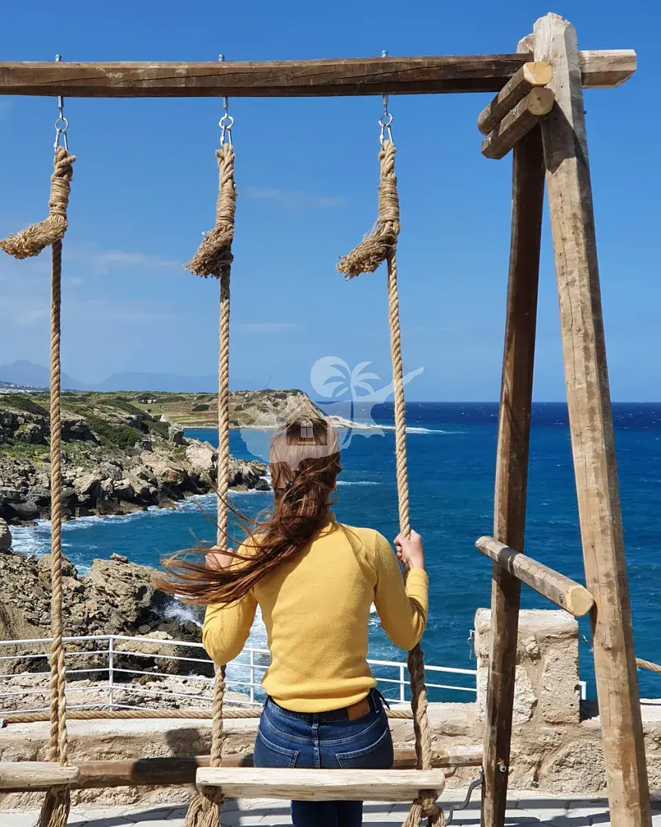 Zadní část komplexu je vyvýšená, s širokoúhlým výhledem na moře a na horský průsmyk na západní straně a úžasným výhledem na západ Slunce nad mořem.