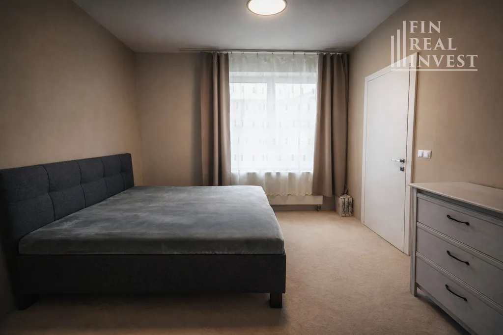 Dominantou bytu je prostorný obývací pokoj s parketovou podlahou, designovými podhledy a nepřímým osvětlením, které vytváří příjemnou atmosféru. Komfort během celého roku zajišťuje klimatizace Samsung Wind Free.