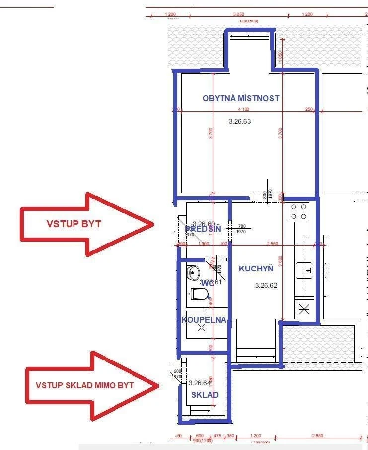Byt sestává z obytné místnosti, kuchyně, koupelny spojené z WC, z předsíně a skladu umístěného mimo byt na společné chodbě.
