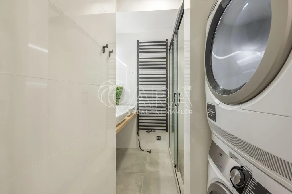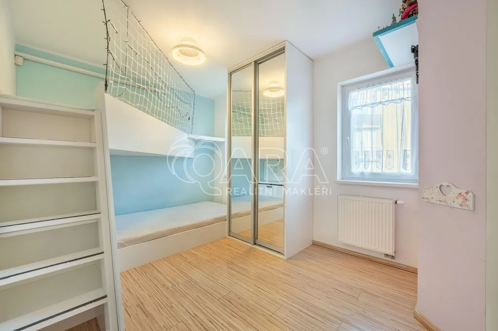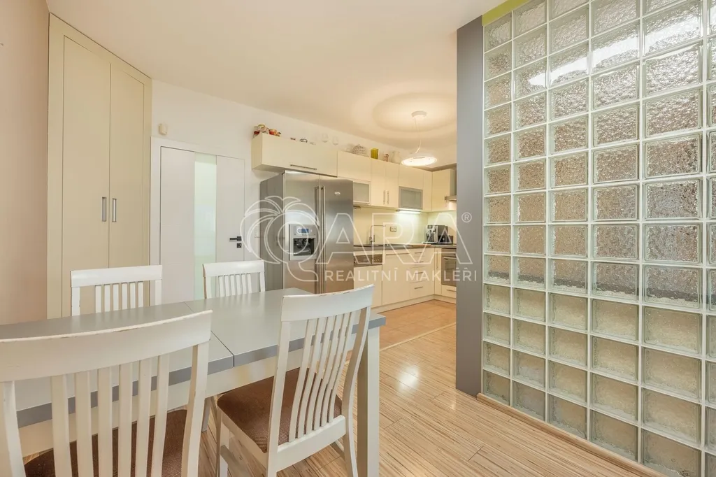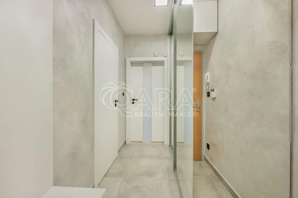 Vstupní chodba je vybavena vestavěnými skříněmi, které poskytují dostatek úložného prostoru. Koupelna disponuje sprchovým koutem, toaletou, dvěma umyvadly. Součástí vybavení je pračka i sušička. Kuchyňský kout s jídelní částí je řešen na míru a plně vybaven spotřebičemi – lednicí, sklokeramickou varnou deskou, troubou, mikrovlnnou troubou a kávovarem. Plynule navazuje na obytný prostor, který lze pomocí posuvných dveří oddělit a vytvořit tak samostatnou ložnici. Ložnice je dále oddělena designovou skleněnou příčkou z luxfer, která propouští denní světlo a zároveň zajišťuje maximální soukromí. Veškerý nábytek je vestavěný a navržen tak, aby byt bylo možné ihned plnohodnotně užívat bez nutnosti dalšího zařízení. Další pokoj, rovněž vybavený vestavěným nábytkem, je ideální jako dětský pokoj. K bytu náleží také zasklená lodžie o velikosti 4 m², která sloužila jako klidná pracovna. Na lodžii je instalována klimatizační jednotka, která v letních měsících byt příjemně ochladí a v zimě umožňuje přitápění, což výrazně zvyšuje komfort bydlení po celý rok.