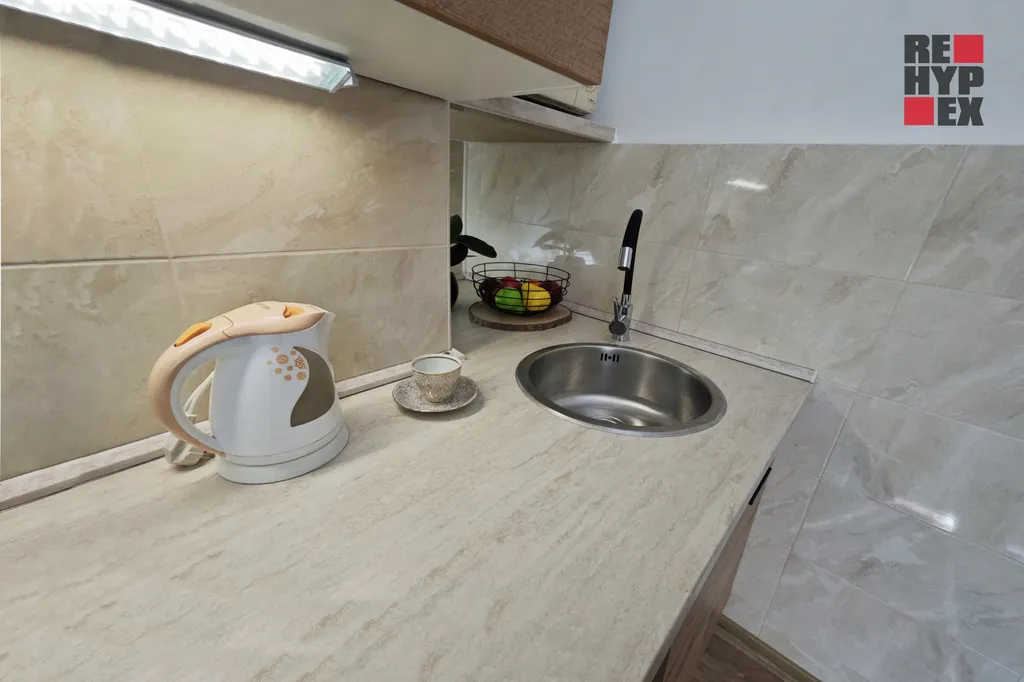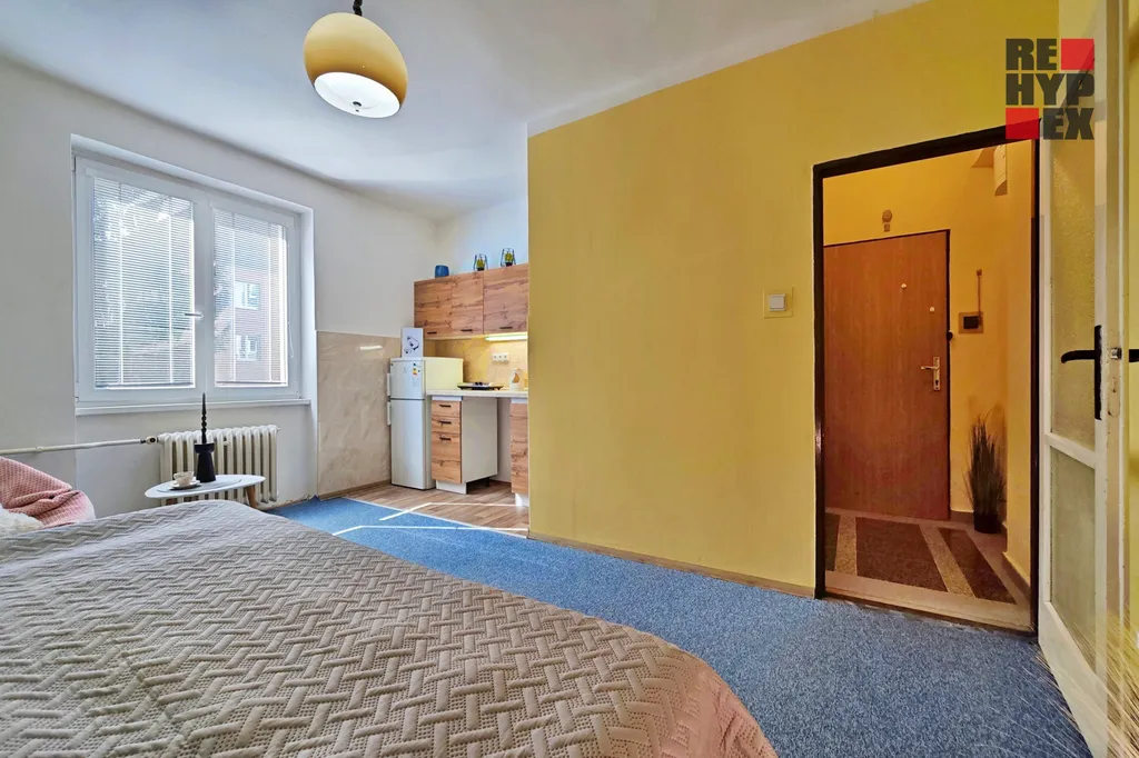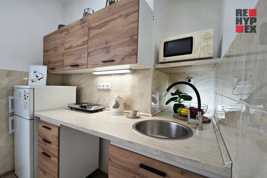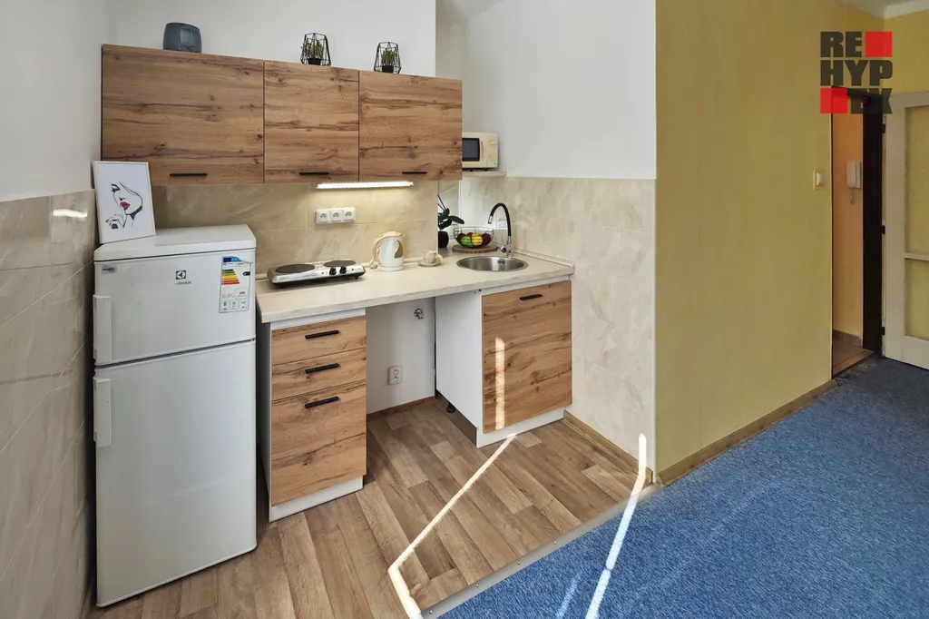 Nabízíme k pronájmu útulný byt 1+kk o celkové ploše 27,6 m² v cihlovém domě na sídlišti nedaleko městského centra. Byt se nachází v 1.NP a je po vydařené rekonstrukci kuchyňského koutu a koupelny. Vytápění je zajištěno ústředním dálkovým topením. Kuchyň je vybavena lednicí s mrazákem, rychlovarnou konvicí, mikrovlnnou troubou a dvou plotýnkovým vařičem. V kuchyni je také ponechán prostor pro připojení automatické pračky. V bytě je možnost připojení na internet pomocí pevného nebo optického kabelu. K využití je také sklepní kóje.
