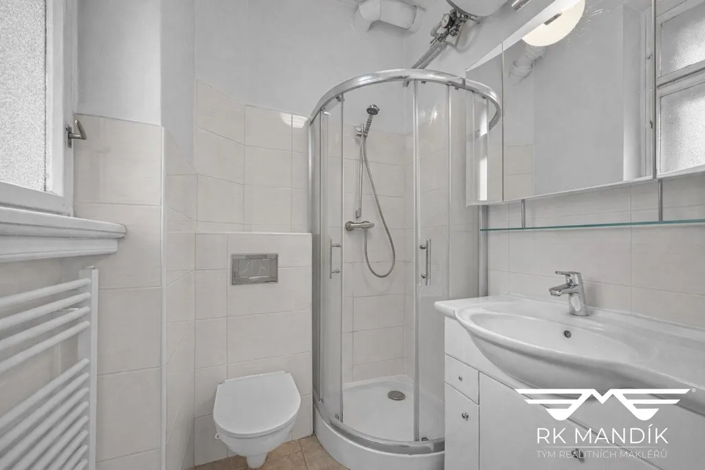 Dispozice bytu je praktická a přehledná: vstupní chodba navazuje na obývací pokoj s kuchyňským koutem, dále je zde samostatná koupelna se sprchovým koutem. V koupelně je instalován elektrický bojler, který zajišťuje ohřev vody. Topení v domě je centrální, což zajišťuje stabilní a bezproblémové vytápění v chladnějších měsících. Z oken bytu je příjemný výhled do klidného vnitrobloku, takže i přesto, že se byt nachází v centru města, nabízí určité soukromí a klid.