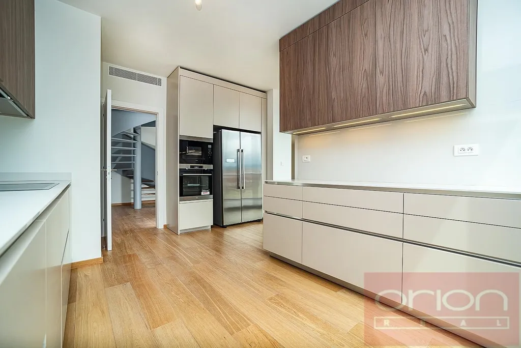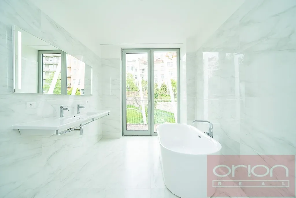 Moderní, luxusní byt 4+kk s dvěma terasami v Rezidenci Ellipsis s 24/7 recepcí, výtahem, podzemní garáží, wellness - bazén, sauna, a rozlehlou zahradou s parkovou úpravou v lokalitě Praha 5 - Smíchov s výborným spojením do centra, do nákupního centra Nový Smíchov, do Německé a Francouzské školy. Byt je ve 4. patře, má plochu 178,35 m2 + terasy 29,47 m2, nabízí halu, prostorný obývací pokoj otevřený s jídelnou a plně vybavenou kuchyní (66,5m2m2) a se vstupem na terasu o velikosti 16,07 m2 s krásným výhledem, 3 ložnice, které mají přímý vstup na terasu o velikosti 13,40 m2, 2 koupelny s vanou, sprchou, toaletou, bidetem (jedna koupelna je přístupná z ložnice), samostatnou toaletu, chodbu a prádelnu. Kvalitní materiály, dřevěné podlahy, velkoformátová dlažba, francouzská okna, bezpečnostní dveře, internet. Sklep. Možnost nájmu garážové stání za poplatek 200 EUR+ DPH/ měsíc. Oblíbená lokalita Praha 5 - Smíchov s dobrým dopravním spojením, v pěší vzdálenosti na stanici metra a tramvaje Anděl, do parku Petřínské sady. NÁJEM 3.800 Euro/měsíc je splatný v eurech. Členský poplatek za wellness 2.500 Kč/měsíc. V přízemí budovy se rovněž nachází fitness centrum Prisma Institut, které je ideálním pro aktivní odpočinek.