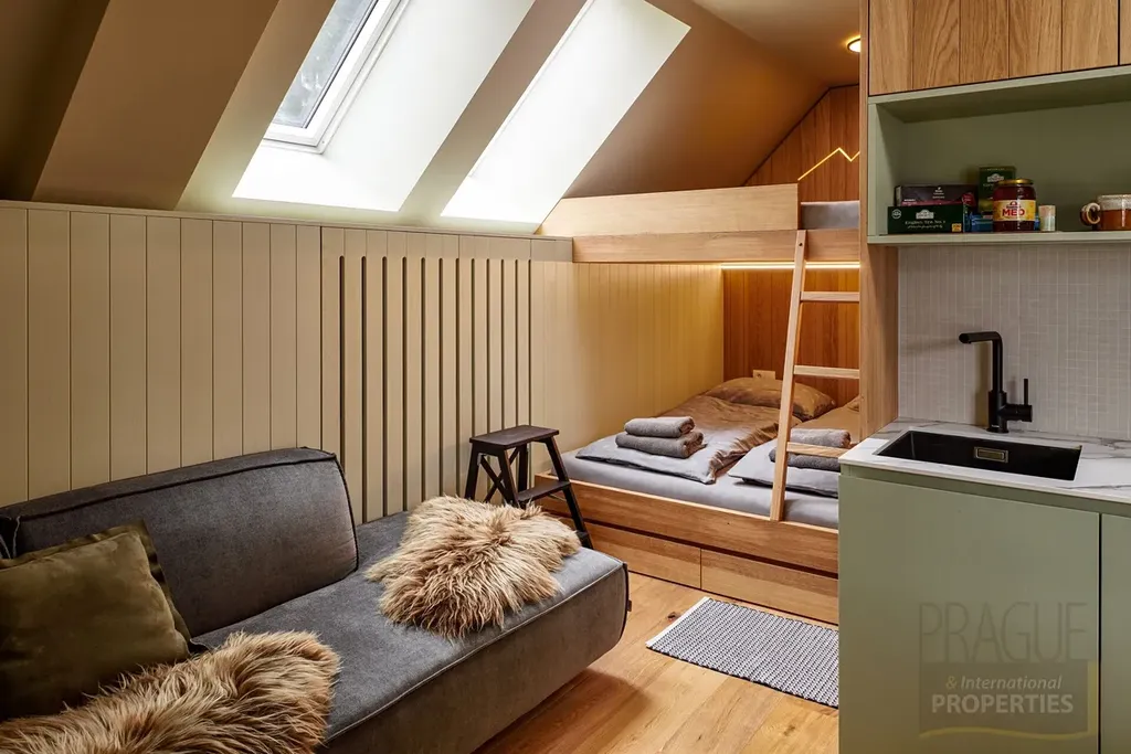 Apartmán je navržen s důrazem na každý detail – od kvalitních přírodních materiálů po stylové vybavení. Prosvětlený interiér s velkoformátovými okny se vstupem na balkon, kuchyňská linka plně vybavená spotřebiči (lednice, varná deska, mikrovlnná trouba, myčka), koupelna s prostorným sprchovým koutem a podlahovým vytápěním, obývací a spací zóna v harmonickém spojení, s kvalitní patrovou postelí a pohodlným posezením.