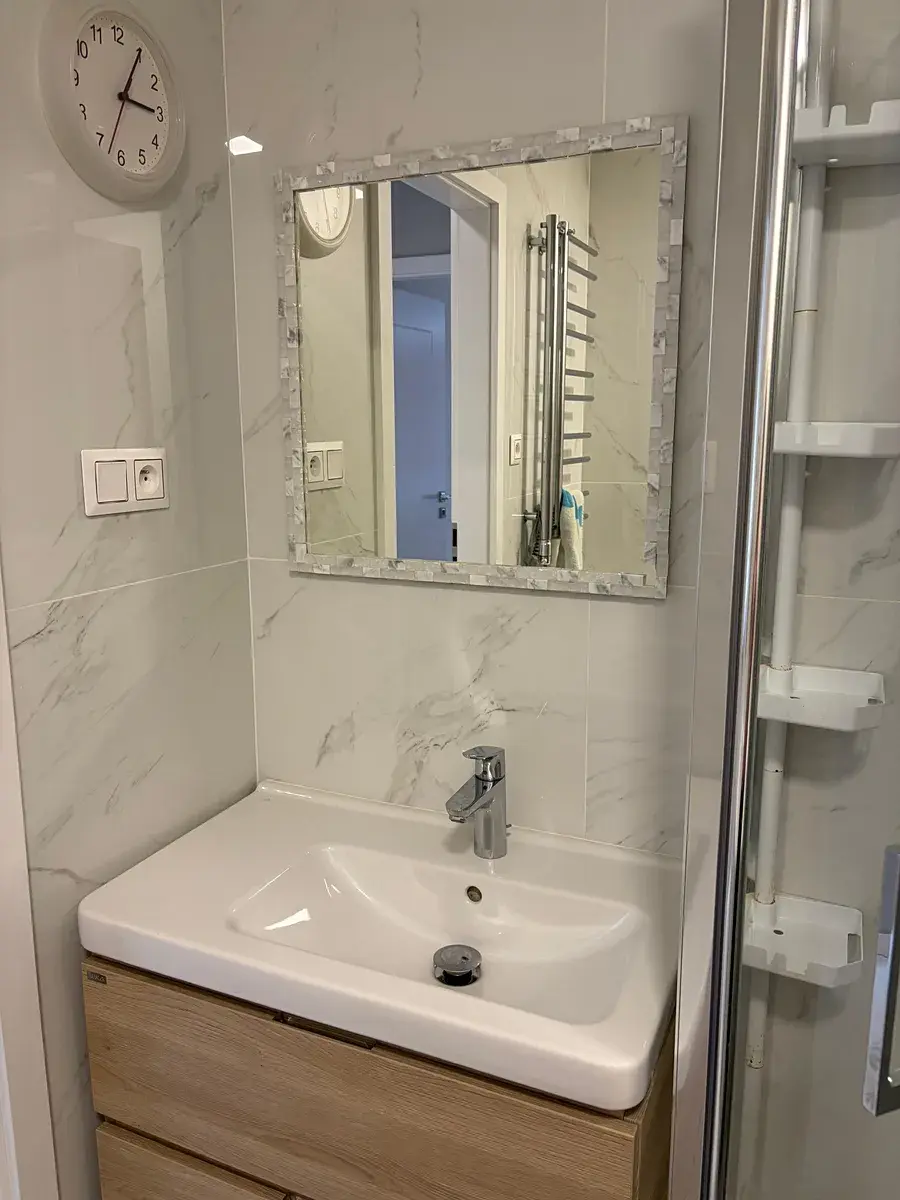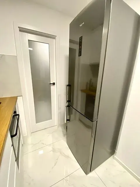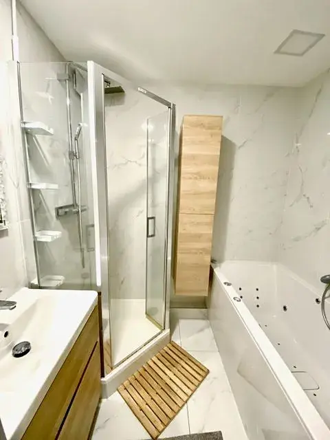 Bytová jednotka prošla v roce 2022 kompletní rekonstrukci. Vstupem do bytu se ocitnete v chodbě (10,5 m2), z které se po levé straně vstupuje do obývacího pokoje 5,4 x 5,4 m (29 m2) a kuchyně 4,3 x 2,1 m (9 m2) s kuchyňskou linkou včetně vestavěných spotřebičů (indukční varná deska, trouba, digestoř, mikrovlnná trouba, myčka nádobí a samostatná lednice). Kuchyň je zároveň průchozí s obývacím pokojem přes dvoukřídlé posuvné dveře. Obývací pokoj je vybaven sedačkou, konferenčním stolkem, jídelním stolem a nástěnným krbem na bioplyn. Z obývacího pokoje je ještě vstup na lodžií s výhledem do dalekého okolí.
