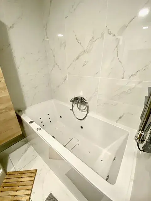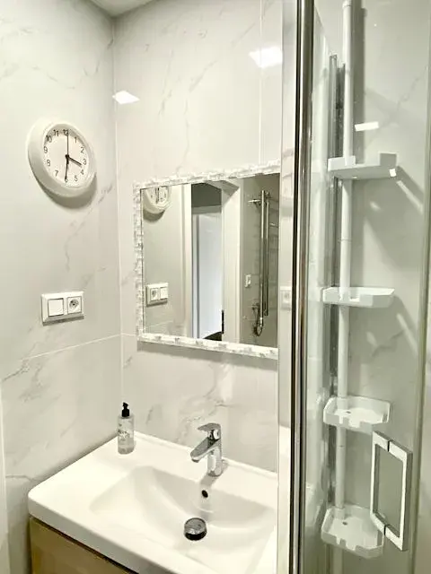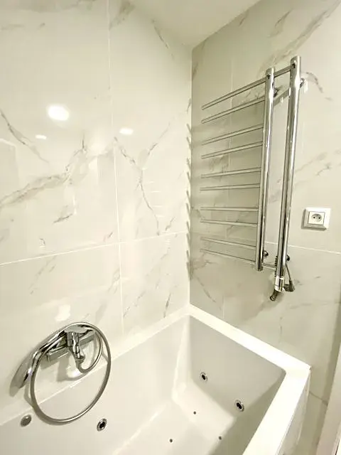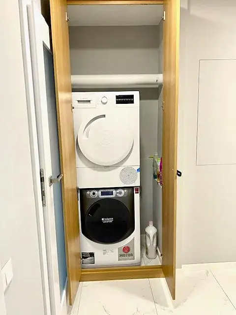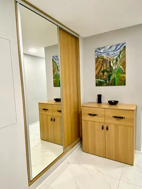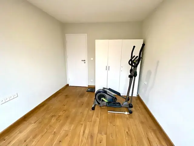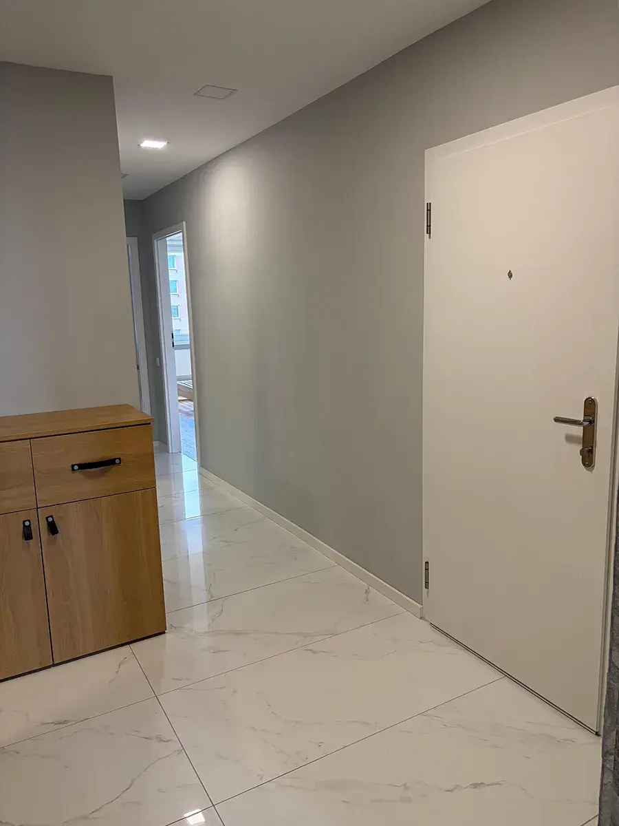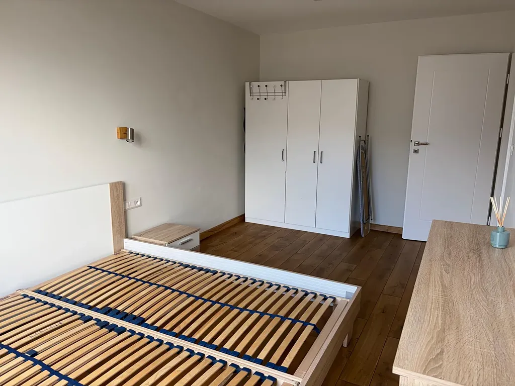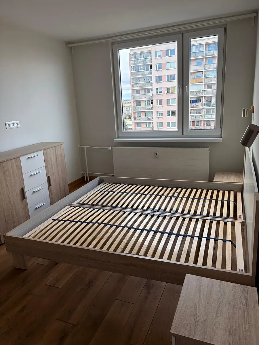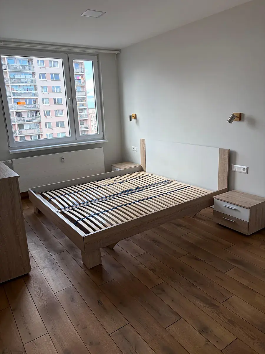 Po pravé straně od vstupu do bytu se nachází ložnice 5,2 x 2,9 m (15 m2) s manželskou postelí bez matrace a nočními stolky, komodou a skříní, vedle ložnice je umístěn dětský pokoj 3,8 x 2,8 m (10,7 m2) se skříní. Z prostorné chodby je ještě vstup do koupelny 1,7 x 2,1 m (3,6 m2) s masážní vanou, sprchovým koutem, umývadlem se spodní skřínkou, zrcadlem a závěsnou skřínkou. Vedle koupelny je umístěna toaleta 1,7 x 0,9 m (1,5 m2) s umývadlem se spodní skřínkou a zrcadlem. V chodbě se nachází prostorná vestavěná skříň se zrcadlem, komoda a další vestavěná skříň, kde je umístěna pračka a sušička.