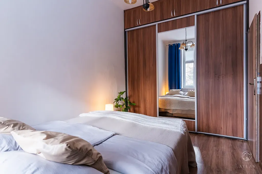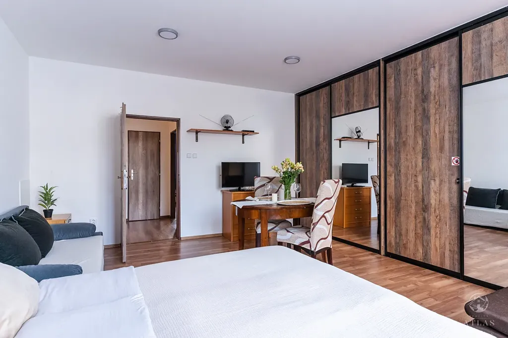 Interiér působí světlým a útulným dojmem, díky velkým oknům je byt krásně prosvětlen po celý den. Součástí vybavení je kuchyňská linka se spotřebiči, vestavné skříně, dostatek úložných prostor a možnost ponechání vybavení po dohodě.
