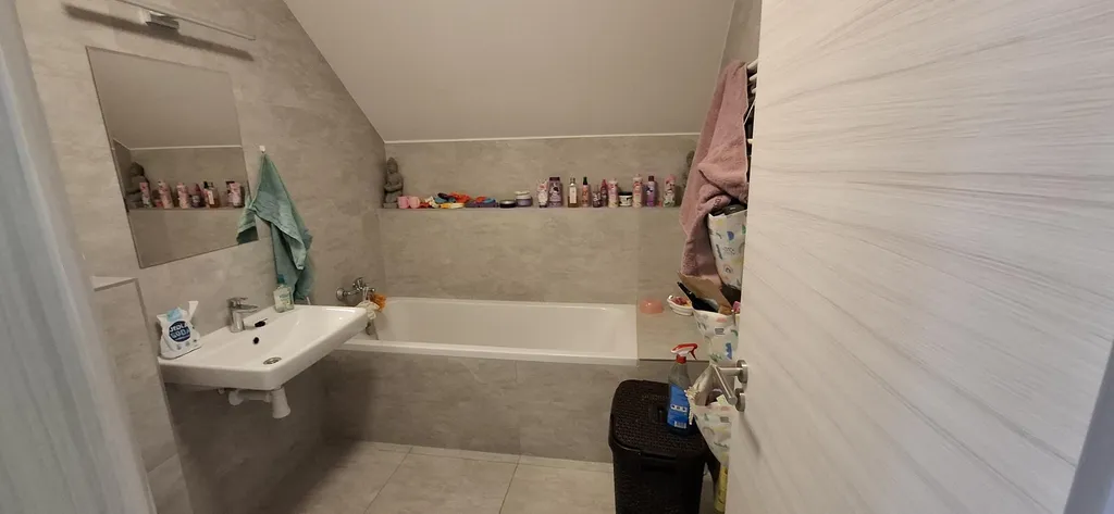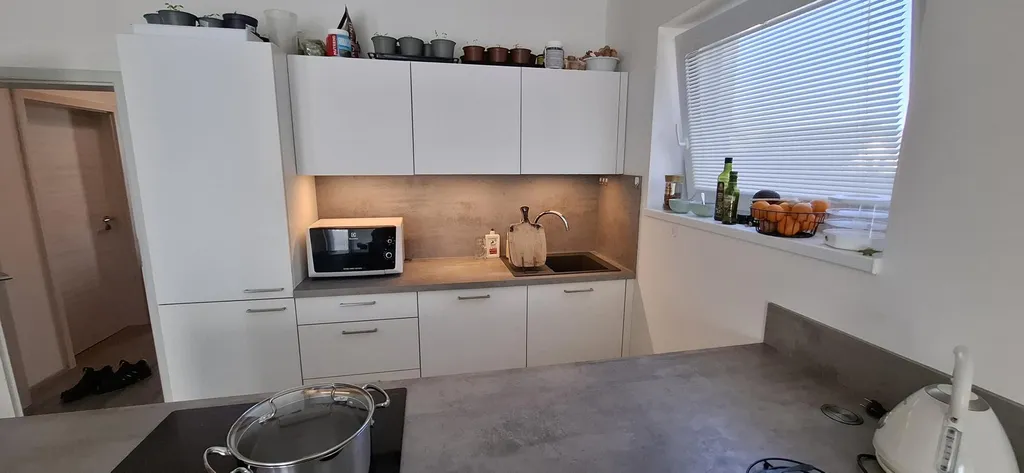 1.patro: hala, samostatné vstupy do tří pokojů, koupelna s vanou a WC, šatna. Teplovodní podlahové topení, elektrický kotel se zásobníkem na ohřev vody, plastová okna trojsklo, na podlaze dlažba a lepená vinylová podlaha, kuchyňská linka včetně spotřebičů. V obci veškerá občanská vybavenost. Volný od 1.6-2026.