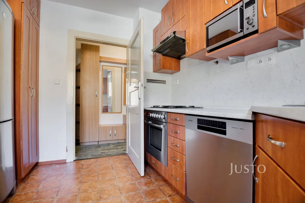 Byt je částečně vybavený a jeho součástí je prostorná kuchyně s jídelním stolem, myčkou, lednicí, troubou, mikrovlnkou a plynovou varnou deskou. V koupelně je k dispozici vana a k bytu patří také pračka. Úložné prostory zajišťují vestavěné skříně. Byt má plastová okna a lokální plynové topení s radiátory, zdroj teplé vody i vytápění je řešen plynovým kondenzačním kotlem.