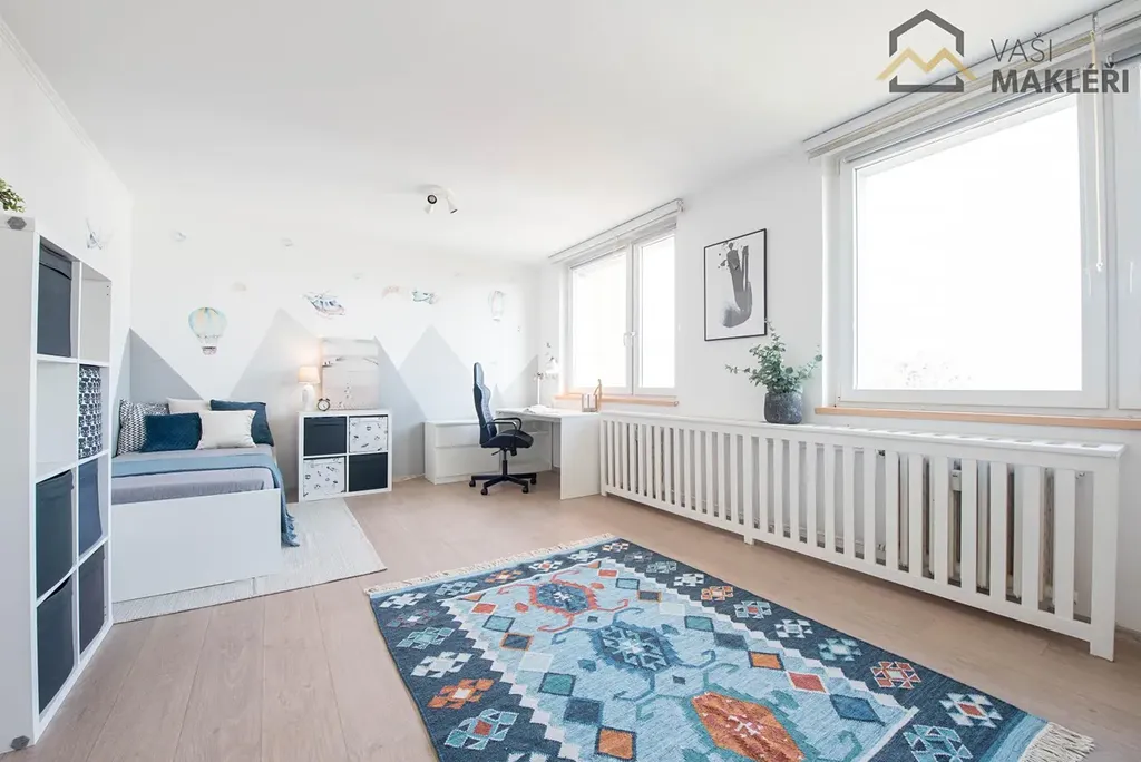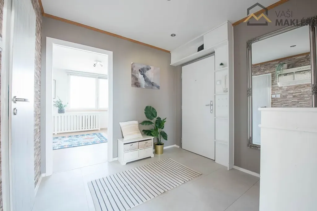 Interiér nemovitosti je přizpůsoben současným potřebám bydlení s důrazem na pohodlí a praktičnost. Rozložení místností můžete načerpat z přiloženého půdorysu, jedná se o oblíbené dispoziční řešení s členěním na obývací pokoj (včetně jídelní části) s kuchyňským koutem (plně vybavená kuchyňská linka, kvalitní spotřebiče, vestavěná chladnička), prostornější ložnici (vestavěná skříň a vstup na zasklenou lodžii), opravdu prostorný dětský pokoj (lze pohodlně rozdělit na dva samostatné pokoje), koupelnu s vanou (jádro bylo vyzděno a zvětšeno), samostatnou toaletu (nové stoupající rozvody) a příjemné zádveří (možnost úložných prostor). Jako další úložný prostor lze využít sklep a ke společnému užívání jsou dvě kolárny.