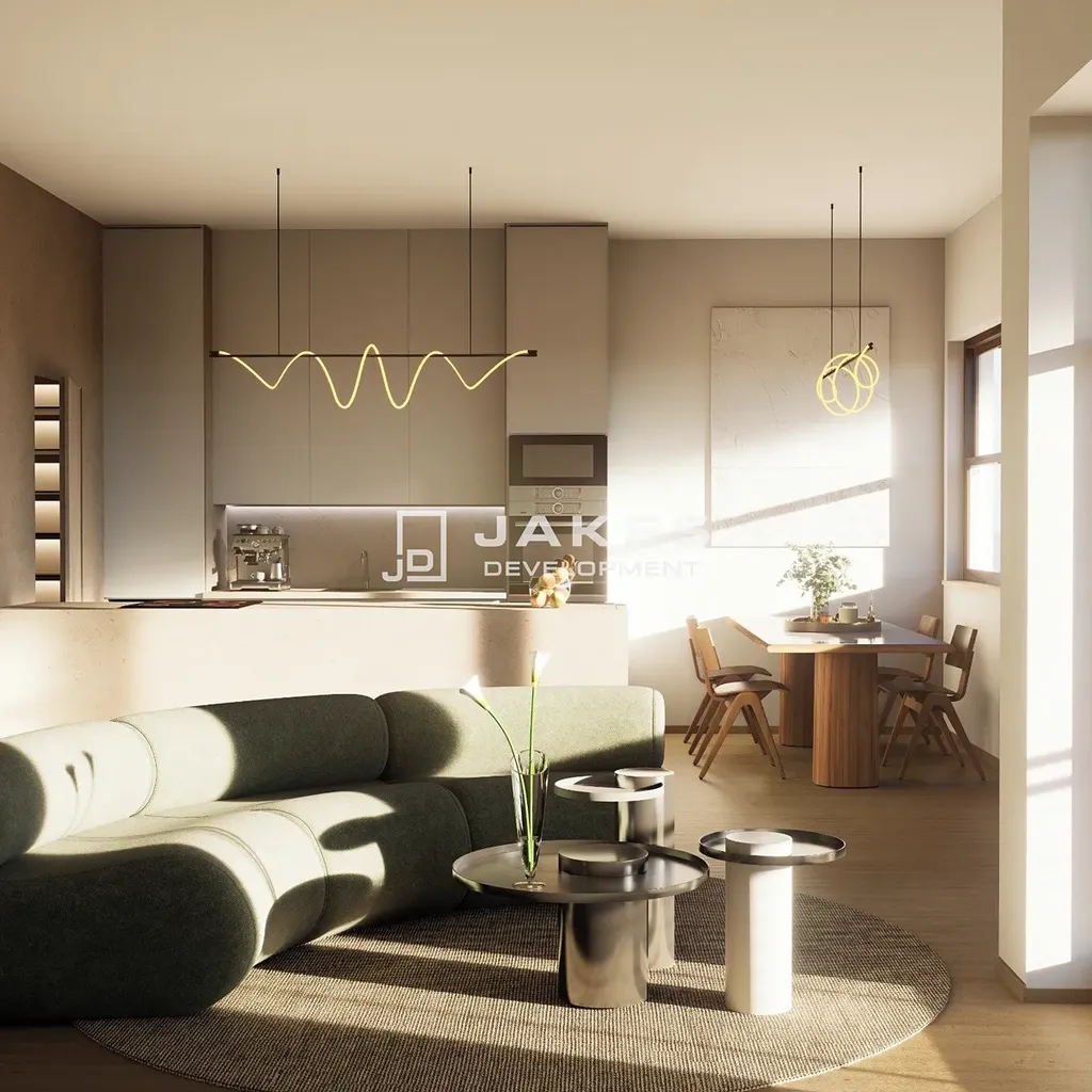 Byt bude dokončen ve vysokém standardu. Interiér nabídne dřevěné podlahy, sádrové omítky, ambientní osvětlení a interiérové žaluzie. Koupelna bude vybavena podlahovým vytápěním, praktickým úložným systémem niky ve sprchovém koutě a sanitou značky Laufen. Vše je navrženo s důrazem na nadčasový design, funkčnost a kvalitu použitých materiálů.