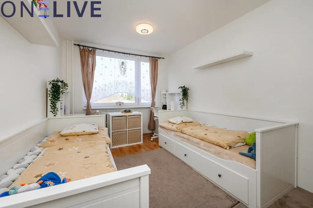 Byt nabízí praktické dispoziční řešení. Dominantou bytu je prostorný obývací pokoj propojený s kuchyňským koutem a jídelní částí, který je díky velkým formátům oken krásně prosvětlený. Kuchyňský kout prošel nedávnou rekonstrukcí a je vybaven moderní kuchyňskou linkou s dostatkem úložného i pracovního prostoru. Součástí bytu jsou také dva samostatné pokoje vhodné například jako ložnice a dětský pokoj či pracovna. K dispozici je koupelna s WC, kde se nachází jak sprchový kout, tak vana. Vytápění je řešeno centrálním dálkovým rozvodem.