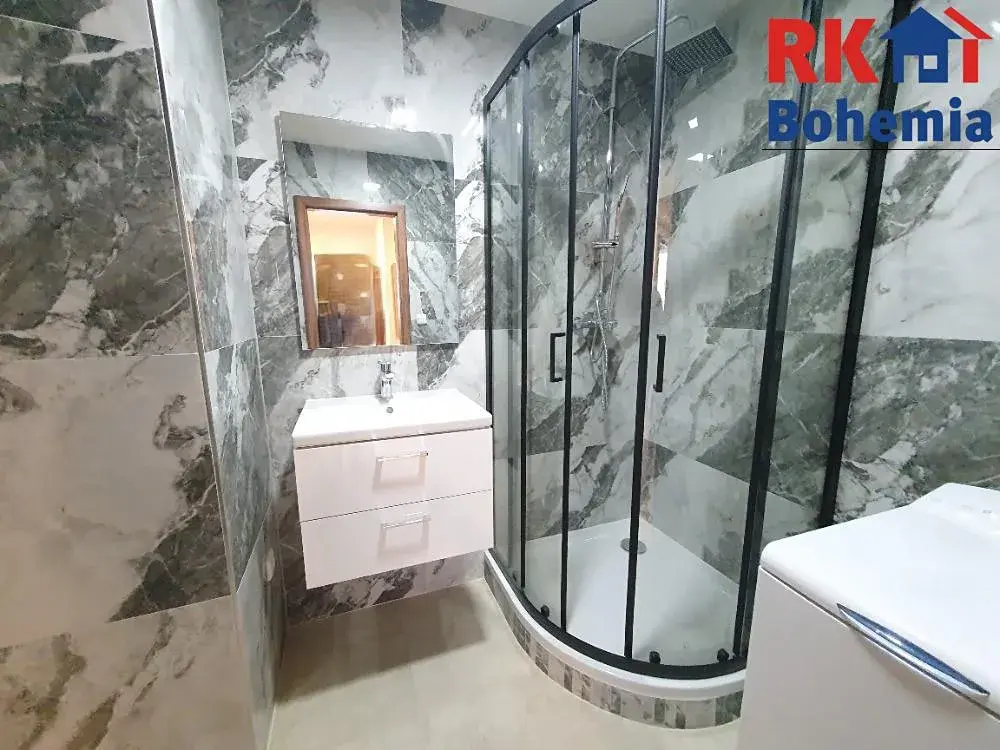 Koupelna se sprchovým koutem a prostorem pro pračku i sušičku.