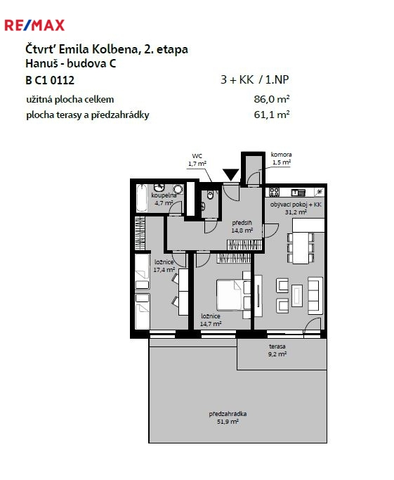 - obývací pokoj s kuchyňským koutem (31,2 m²), vstupem na terasu (9,2 m²) a předzahrádku (51,9 m²)