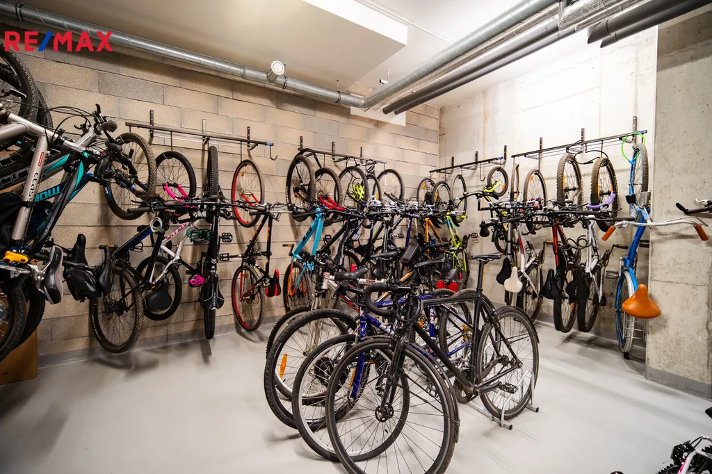 K bytu náleží také dvě nadstandardně velká garážová stání (24,5 m² a 28,7 m²) a prostorný sklep o velikosti 12,1 m², což zajišťuje dostatek úložného prostoru i komfortní parkování.