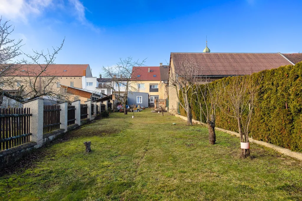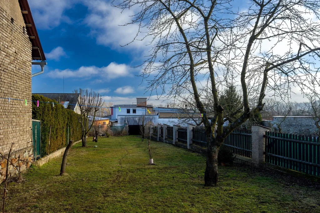 Celková plocha parcel 823 m². Napojení na všechny obecní sítě — plyn, voda, kanalizace, elektřina. Centrální plynový kotel. Zahrada využívaná nájemníky. Vjezd na pozemek.