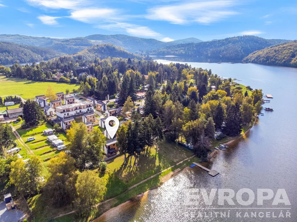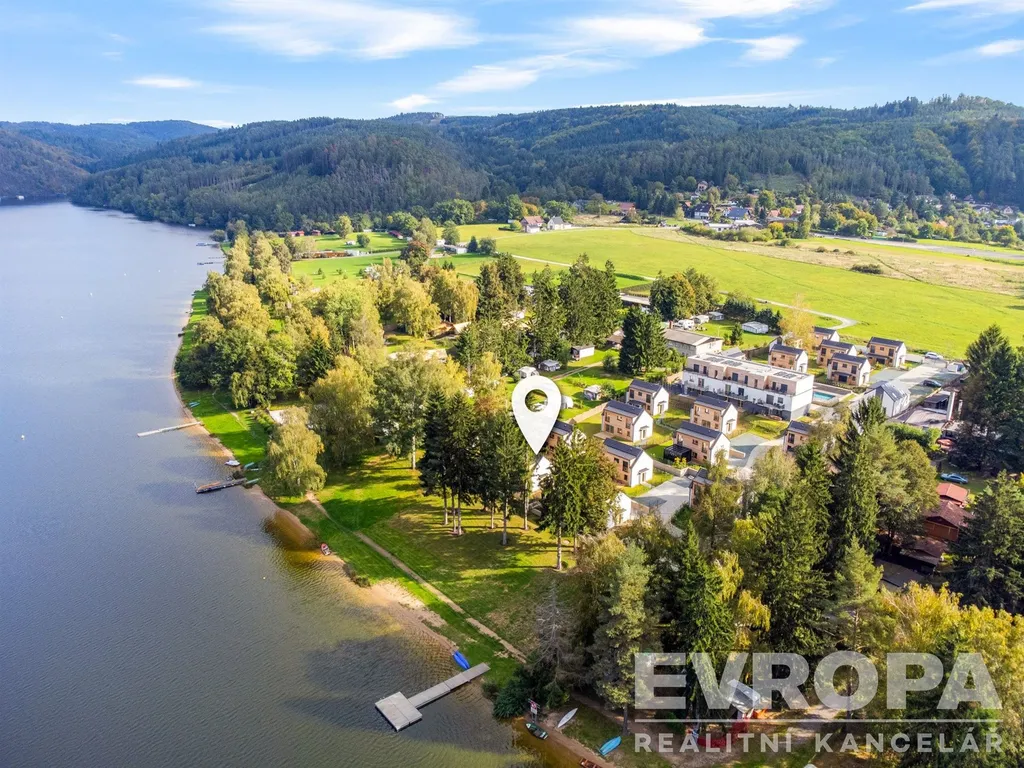 Nabízíme k prodeji moderně zařízenou chatu (112,8 m2) s pozemkem (270 m2) v první řadě od pláže v luxusním areálu Lakeside Resortu Slapy. Od tohoto domu je to cca 30 metrů přímo na písečnou pláž Slapské přehrady.
