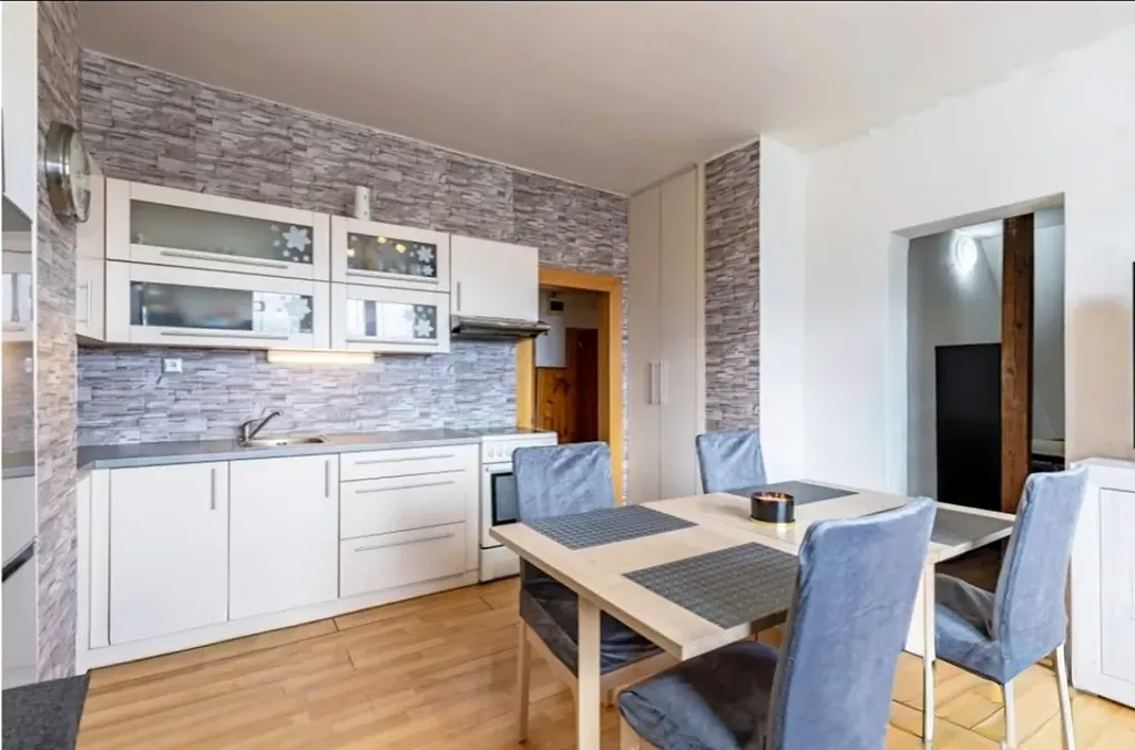Nabízíme k prodeji velmi pěkný slunný byt 4+kk o rozměrech 75 m2 v obci Chlumín, okres Mělník, ve třetím patře cihlového domu. V bytě jsou plastová okna, zděná koupelna, na podlahách plovoucí podlaha a PVC. Byt je dispozičně řešený jako 3+kk a čtvrtá místnost je bez okna a v současné době využívána jako pokoj pro hosty. Může sloužit i jako šatní prostor. K bytu je k dispozici sklepní koje. Parkování přímo u domu.
