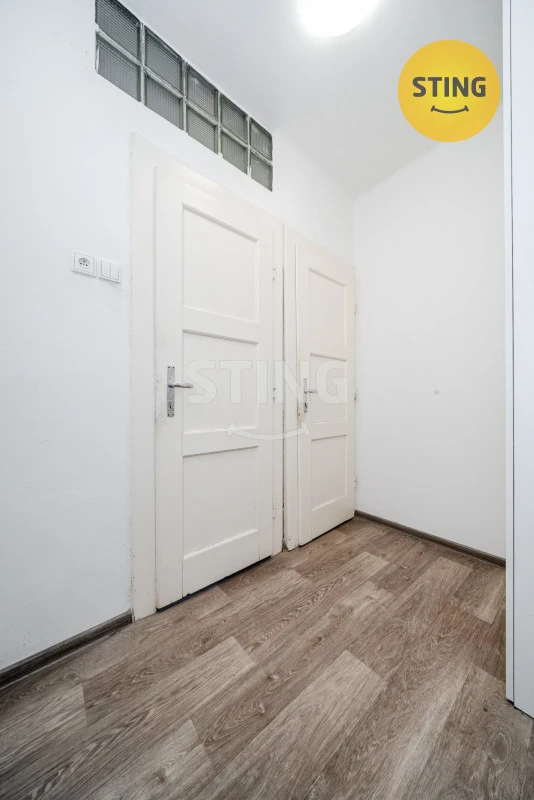 Vstup do bytu - prostorná chodba s vestavnou skříní na míru (botník, panel na odkládání svršků). Z chodby je vstup do koupelny se zděným jádrem, která je vybavena vanou, umyvadlem se skříňkou, obklady a dlažbou a také do samostatného WC. V obou případech je velkou výhodou okno zajišťující přirozené větrání a denní světlo. V koupelně je také místo pro pračku a plynový kotel.