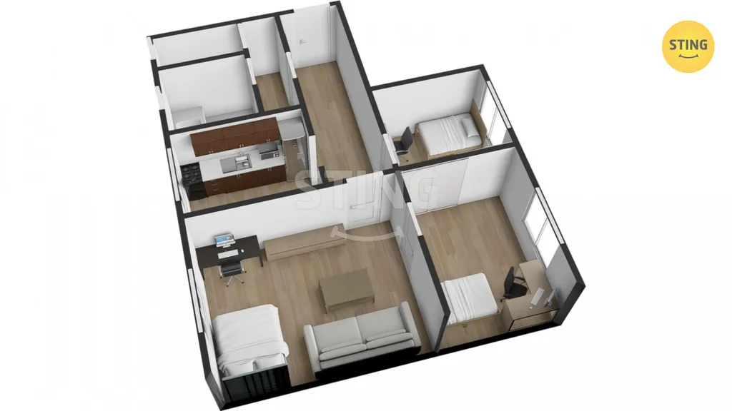 Dominantou bytu jsou tři prostorné a světlé pokoje: obývací pokoj 20,51 m², další dva pokoje o výměrách 15,39m² a 11,21 m². Ve dvou pokojích jsou instalovány praktické vestavné skříně. Na podlahách je položen vinyl, který je odolný a snadný na údržbu.