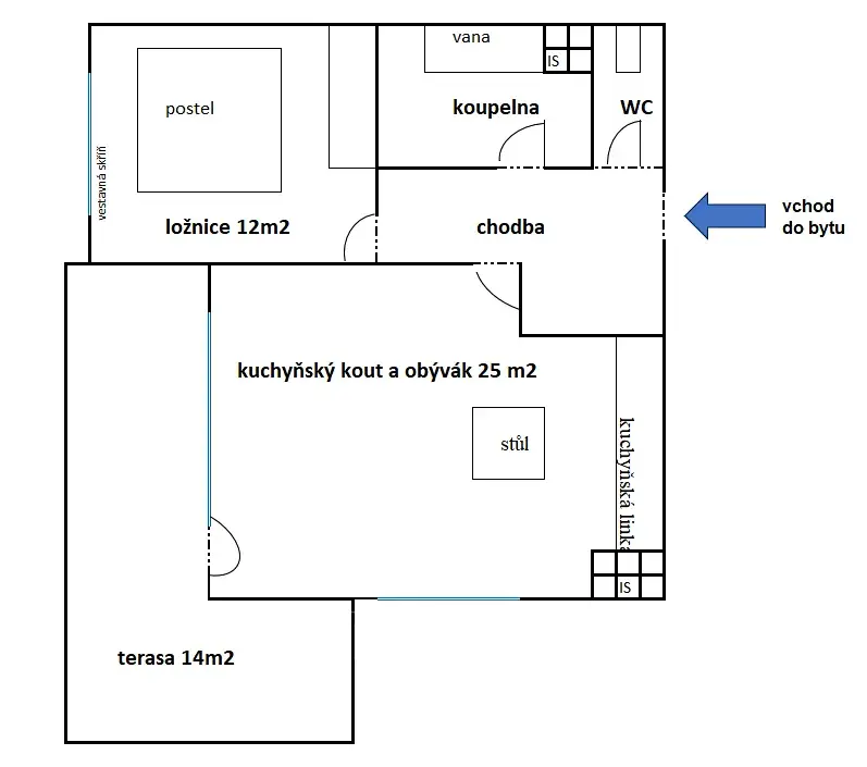 Dispozice bytu zahrnuje ložnici o rozměrech 12 m², prostorný obývací pokoj spojený s kuchyní o velikosti 25 m², chodbu o rozloze 6 m², koupelnu o velikosti 5,5 m² a samostatné WC o velikosti 1,5 m². Podlahy v kuchyni a ložnici jsou plovoucí, v ostatních prostorách je dlažba, což zajišťuje snadnou údržbu a moderní vzhled.