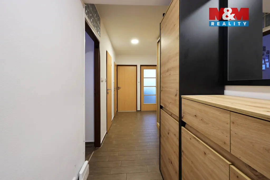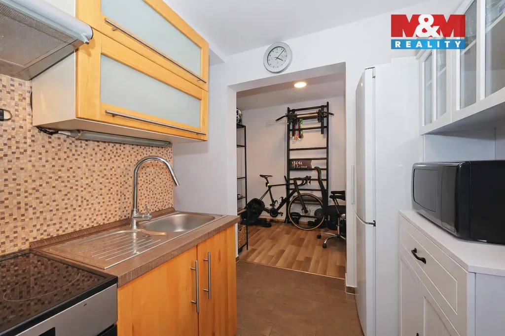 Při vstupu do nemovitosti se dostanete na prostornou chodbu, kde po levé straně vstupujete do kuchyně, která je propojena s menší místností vhodnou k využití jako jídelna, nebo pracovna, jak to mají současní majitelé. Dále je zde koupelna s vanou, samostatná toaleta a dva světlé neprůchozí pokoje. Jeden z nich má vstup na balkon. K bytu náleží sklep.