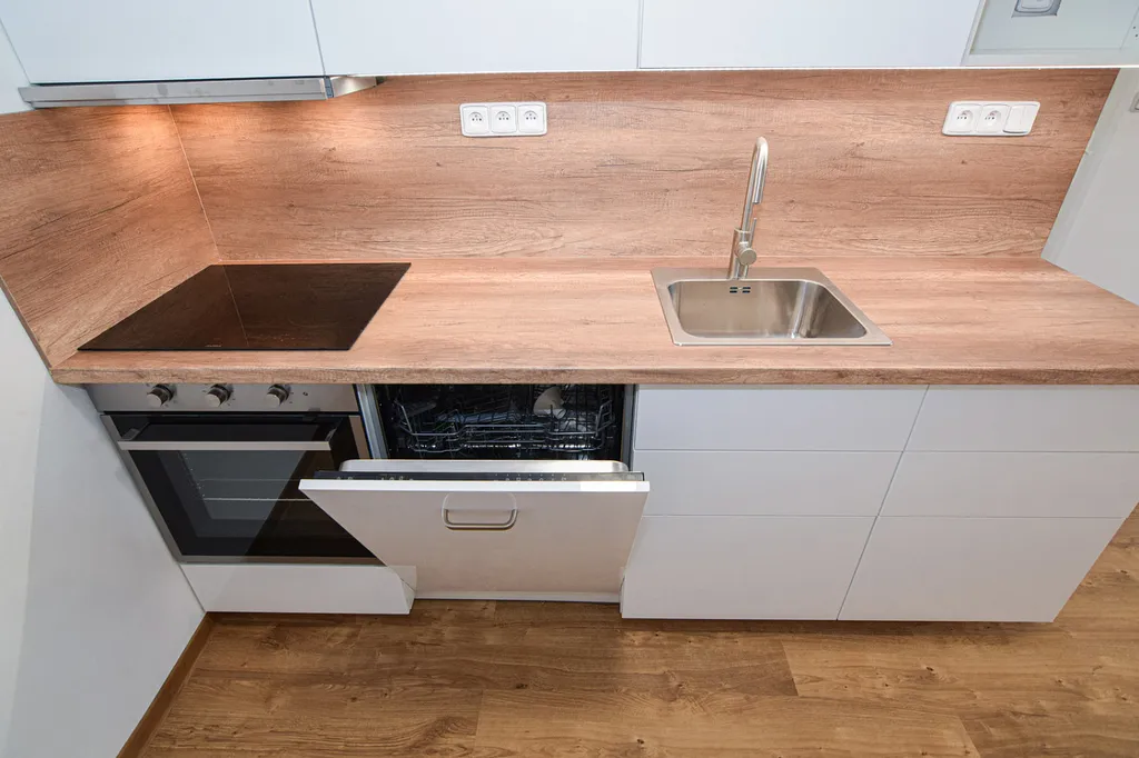 Byt disponuje obývacím pokojem s navazující kuchyní. Moderní kuchyňská linka je vybavena veškerými spotřebiči – varnou deskou, elektrickou troubou, myčkou na nádobí, je možné dodat volně stojící lednicí s mrazákem.