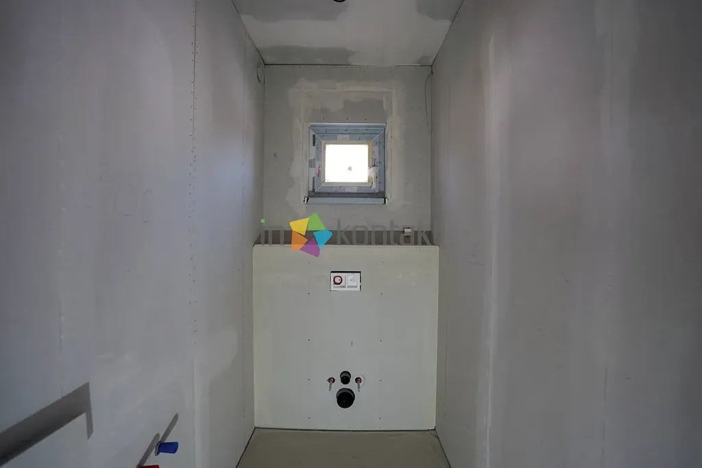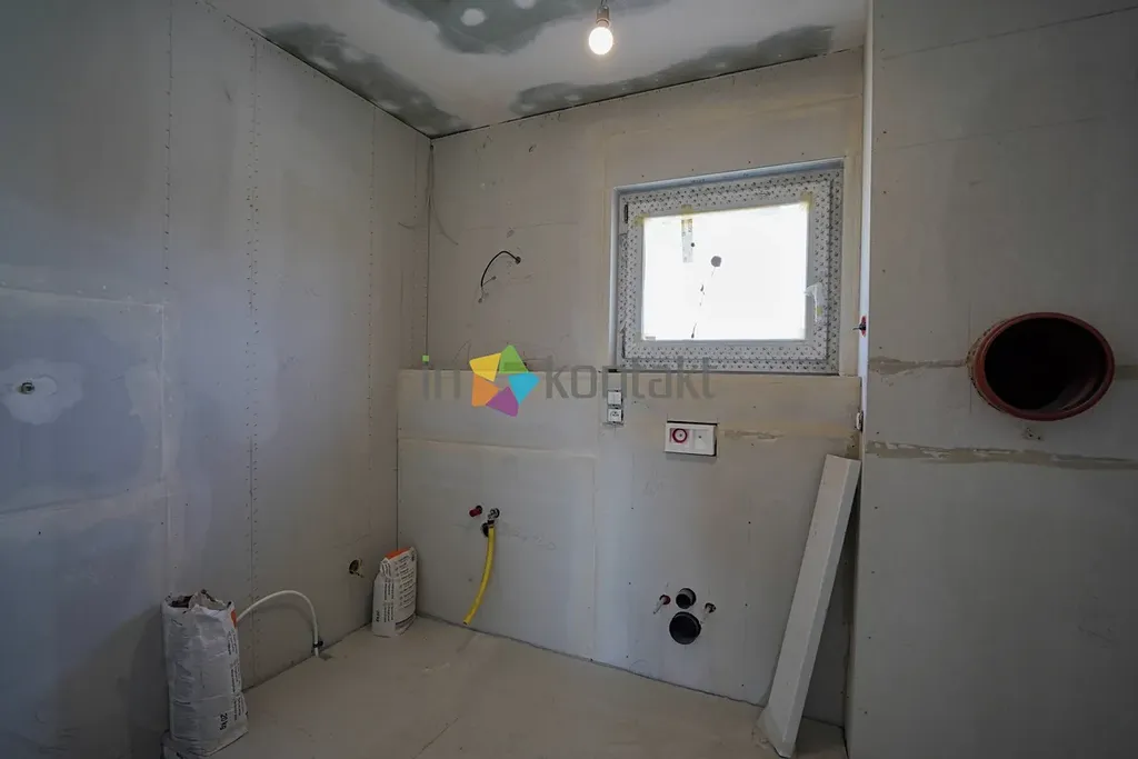 Aktuální stav a dokončení: Dům se prodává ve stavu rozestavěné stavby tak, jak je detailně zachyceno na fotografiích a v přiložených půdorysech. Budoucí majitel si tak sám podle svého vkusu a rozpočtu zajistí finální povrchy (výmalbu, podlahové krytiny), sanitu, interiérové dveře, kuchyňskou linku, venkovní úpravy soklu a finální zdroj vytápění.