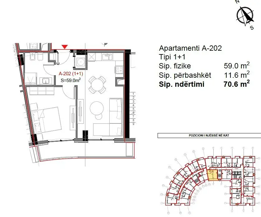 Apartmán pod interním označením ALB382A_202 se nachází na druhém patře budovy A. Jedná se o jednoložnicový apartmán o užitné ploše 59 m2 s koupelnou a obývacím pokojem spojeným s kuchyňským koutem. Z obývacího pojoje a ložnice je přístup na balkón o velikosti 11,6 m2 s výhledem na moře. Celková plocha apartmánu činí 70,6 m2.